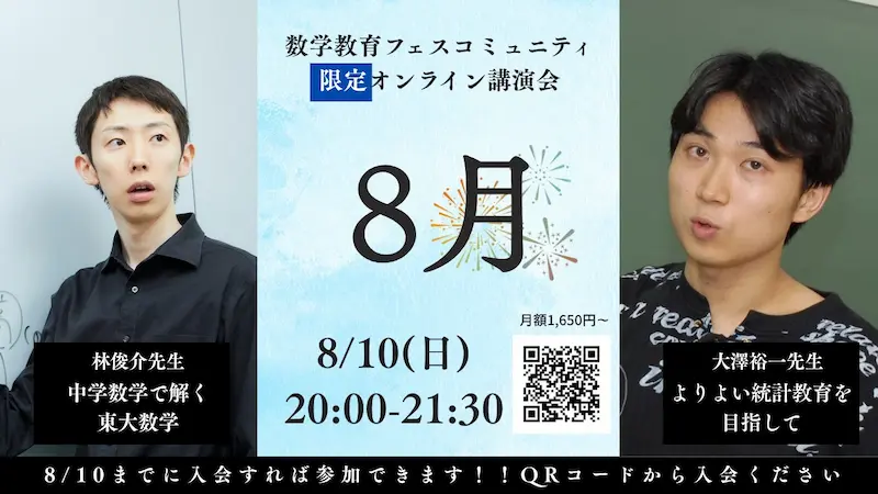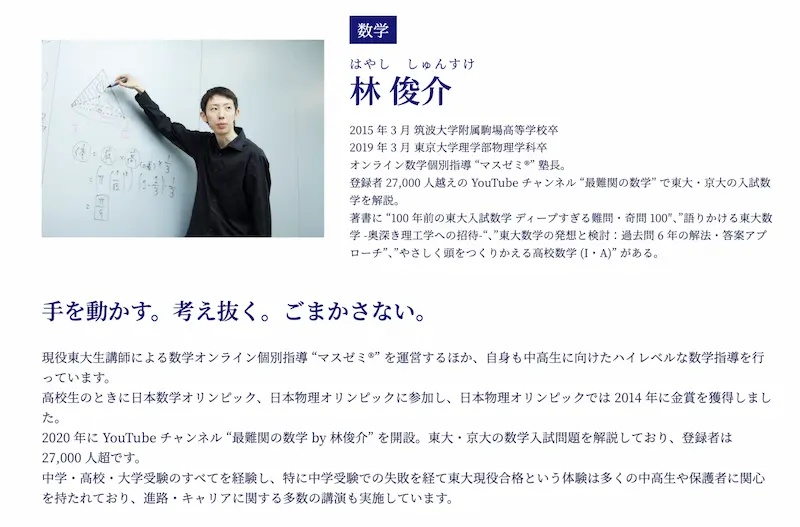 東大生講師によるオンライン数学指導 “マスゼミ” の塾長でもあります.海外や地方に住んでいる中高生に,良質なオンライン指導をお届けしています.