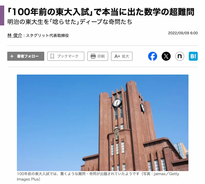 東洋経済オンライン “「100年前の東大入試」で本当に出た数学の超難問”